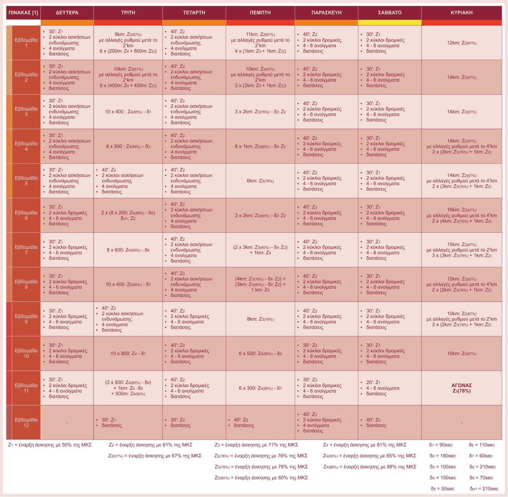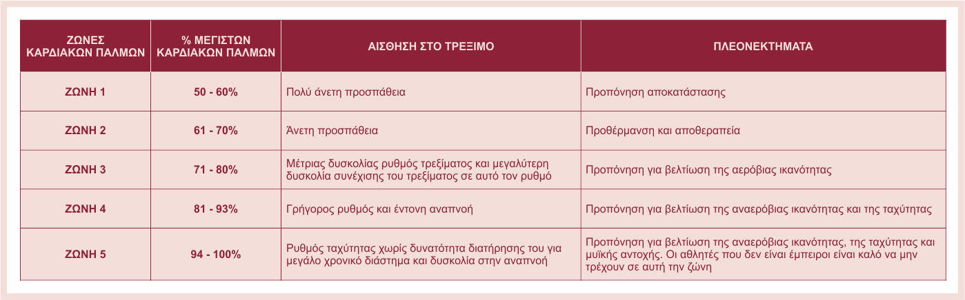 Αφού βρούμε την ΜΚΣ, οι ζώνες καρδιακών παλμών που θα βασιστεί το προπονητικό πλάνο υπολογίζονται όπως στον παρακάτω πίνακα.